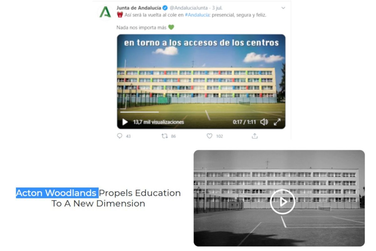 Y lo hace a través de este documento institucional de autobombo, con imágenes que no se corresponden con centros andaluces. Las de interior son imágenes de archivo genéricas de clases. Uno de los clip de exterior de un centro educativo extranjero que nada tiene que ver con Andalucía, tal y como denunciaba el usuario de Twitter y profesor andaluz con el sobrenombre de Maestro Salieri. Se puede ver a partir del segundo 17.