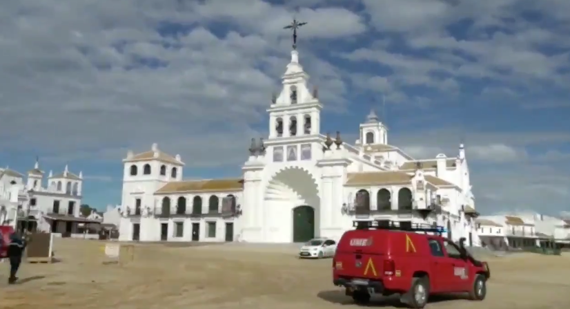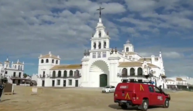 Efectivos de la Unidad Militar de Emergencias (UME) ha realizado este martes tareas informativas en la aldea almonteña de El Rocío para intentar evitar las concentraciones de personas que se dan en la misma pese a las restricciones establecidas tras decretarse el estado de alarma por la pandemia del coronavirus.
