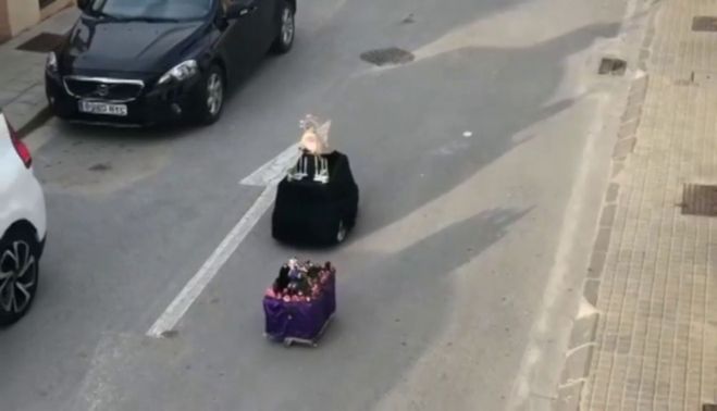 El ingenio pone lo demás. Por eso, en coches teledirigidos controlados desde las viviendas han podido sacar pasear por la calle estos pasos que son más veloces que los reales. En un vídeo se ve cómo los vecinos quedan encantados con la iniciativa, que trata como puede de adaptarse a una potente música de fondo y que tiene incluso un nazareno acompañando las imágenes. A falta de pasos, buenas son miniaturas, sobre todo porque demuestran el amor por una celebración religiosa que este año no ha podido celebrarse.