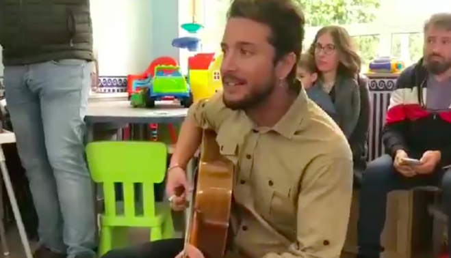 El artista onubense Manuel Carrasco sorprendió a toda la planta de Oncología del Hospital Infantil Virgen del Rocío con su inesperada visita. Y junto a él, su guitarra, la que le acompañó en el tema que el cantante interpretó: No dejes de soñar.