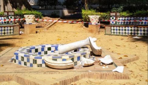 Las fechorías de los vándalos se repiten en este rincón sevillano frecuentado por turistas durante todo el año donde, en la misma glorieta, el consistorio ha tenido que arreglar no hace mucho tiempo los capiteles o las piezas de cerámica que conforman sus bancos. En otra glorieta contigua, también fue destrozada hace menos de año la llamada Fuente de las Copas, diseñada por el arquitecto Juan Talavera entre 1915 y 1917, que ya había perdido uno de sus vasos en un ataque anterior.
