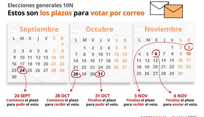 Comienza el calendario para las elecciones del 10N: el plazo para solicitar el voto por correo comenzará el próximo 24 de septiembre, el mismo día en el que el BOE publica la disolución de las Cortes y la convocatoria de elecciones, y finaliza el décimo día anterior a los comicios, es decir, el 31 de octubre.