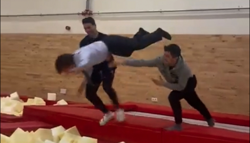 Almeida quiso hacer lo propio y se lanzó de cabeza, saltando desde una cama elástica, a unos bloques de gomaespuma, generando un nuevo vídeo viral que sumar a su larga lista de memes protagonizados durante este mandato.