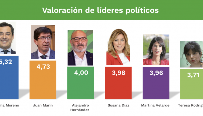 En valoración media, por detrás de Moreno se sitúan el vicepresidente de la Junta y líder de Cs en Andalucía, Juan Marín, con una nota media de 4,73; el portavoz parlamentario de Vox en Andalucía, Alejandro Hernández (4,00); la secretaria general del PSOE-A y expresidenta de la Junta, Susana Díaz (3,98); la secretaria general de Podemos Andalucía, Martina Velarde (3,96), y la ex presidenta del grupo parlamentario Adelante Andalucía y referente de Anticapitalistas, Teresa Rodríguez, con un 3,71 de valoración media.