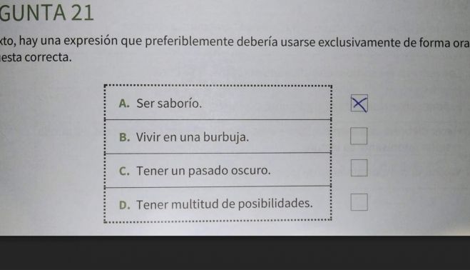Además, una de las preguntas para el alumnado obliga a elegir "una expresión que preferiblemente debería usarse exclusivamente de forma oral" de tres posibles. La respuesta "correcta" para la Consejería sería "Ser saborío".