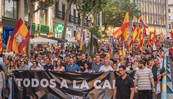 Cientos de personas se han concentrado este viernes por la noche en Madrid en una manifestación convocada por Vox para exigir la dimisión del presidente del Gobierno, Pedro Sánchez. La marcha, que comenzó en las inmediaciones del intercambiador de Moncloa, culminó frente a la sede del PSOE en la calle Ferraz, en un acto donde se han visto banderas de simbología franquista y mensajes de fuerte carga política.
