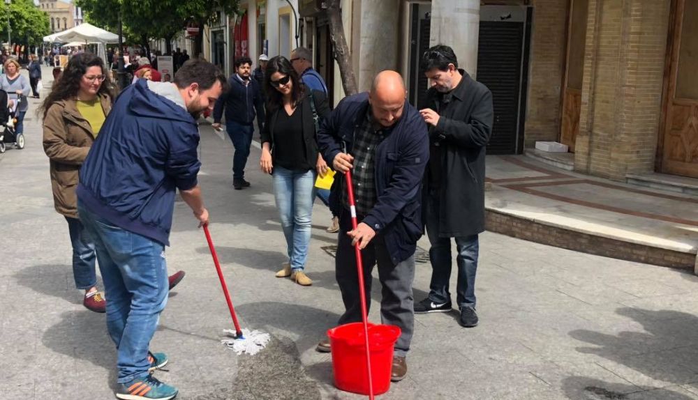 Distintos miembros de los partidos que conforman la coalición de izquierdas Adelante Jerez, con sus dos posibles alcaldables “fregona en mano”, levan a cabo un acto simbólico para "desinfectar de restos fascistas" la zona del Gallo Azul, lugar donde el pasado martes estuvieron los ultraderechistas de Vox repartiendo propaganda de su partido y ante un gran despliegue policial para salvaguardar el stand que habían colocado.