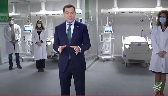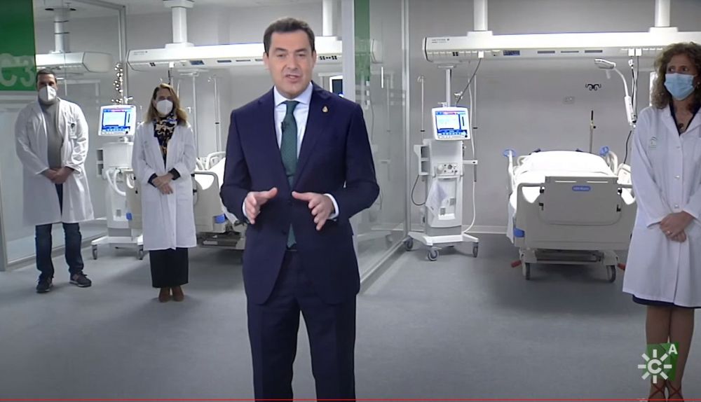 "Me dirijo a vosotros desde un hospital que pronto reabrirá sus puertas, el antiguo Hospital Militar de Sevilla. Un edificio que se cerró hace casi dos décadas y que en enero se pondrá al servicio de todos los andaluces, de manera parcial y transitoria, como Hospital de Emergencia para el Covid-19", comenzaba el presidente andaluz.