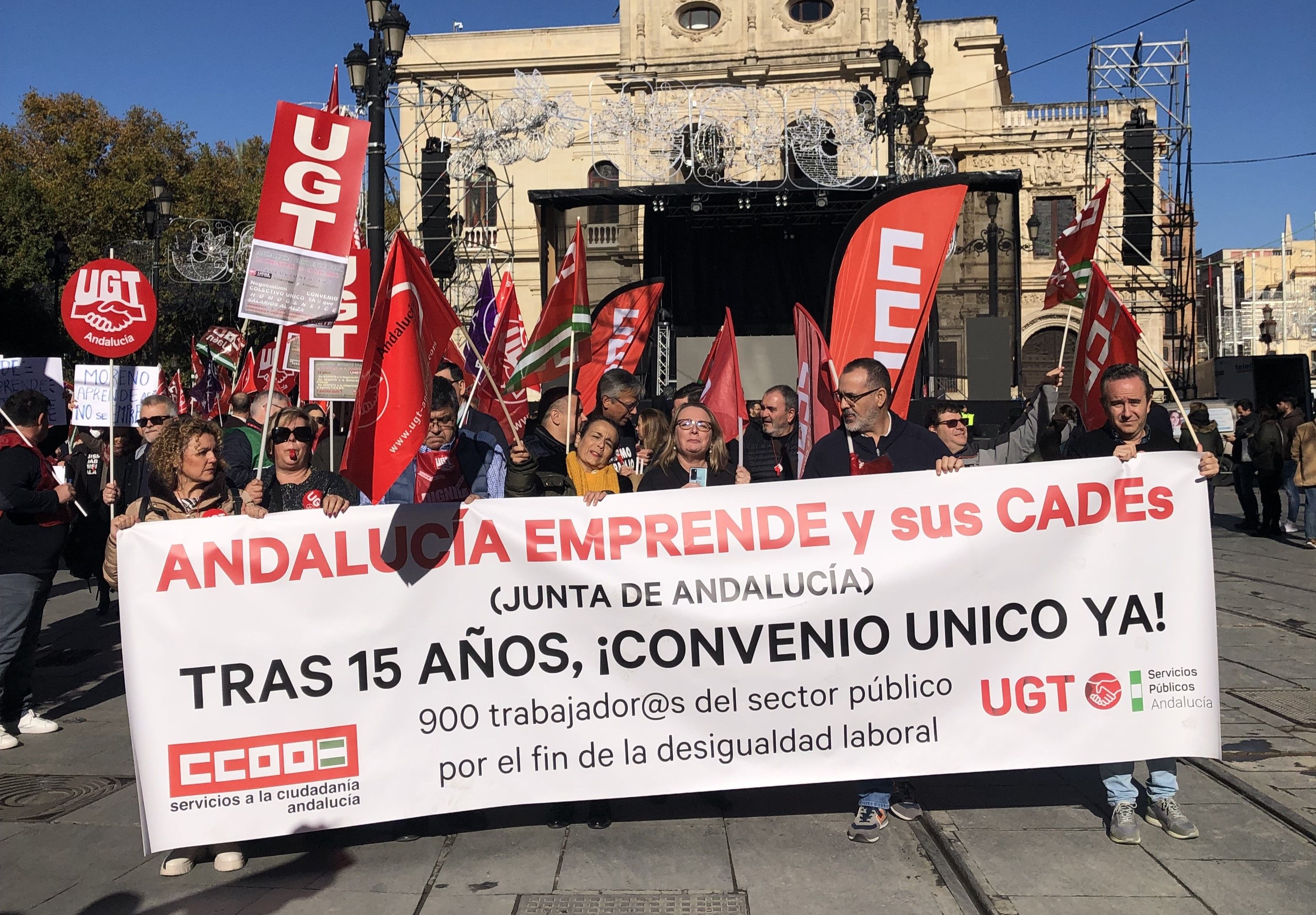 El emprendimiento es una de las banderas de este Gobierno andaluz. Cada mes es habitual ver a Juanma Moreno presumir de los datos de autónomos. Sin embargo, esta satisfacción no existe en la plantilla de Andalucía Emprende. Los trabajadores llevan 14 años con el convenio completamente bloqueado y, aunque ha habido épocas donde las dificultades presupuestarias han impedido sacarlo adelante, lo cierto es que ahora el Ejecutivo reconoce que es cuestión de "voluntad política".