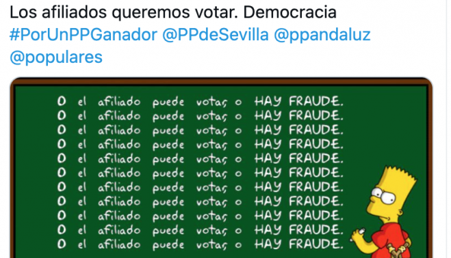 "O el afiliado puede votar o hay fraude", se puede leer en una pizarra, con Bart Simpson al lado, en una meme típico extraído de la serie de dibujos. Quien la publica en sus redes sociales es Juan Ávila, alcalde de Carmona y candidato a la presidencia del PP de la provincia de Sevilla, quien lleva días denunciando "irregularidades" en el proceso.