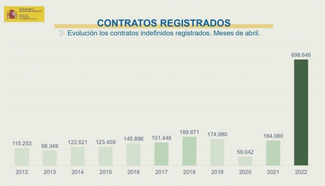 En concreto, en abril se registraron 1.450.093 contratos en España, un 6,9% más que en el mismo mes de 2021. De todos ellos, 698.646 fueron contratos indefinidos, la mayor cifra de toda la serie en cualquier mes, de forma que dicho volumen de contratos fijos fue un 325,8% superior al de abril de 2021 y representa el 48,2% del total de contratos efectuados en el cuarto mes del año. El gráfico que ha difundido el Ministerio es elocuente: los dientes de sierra de los contratos indefinidos de los últimos años, casi siempre parejos, se han disparado en el último mes.