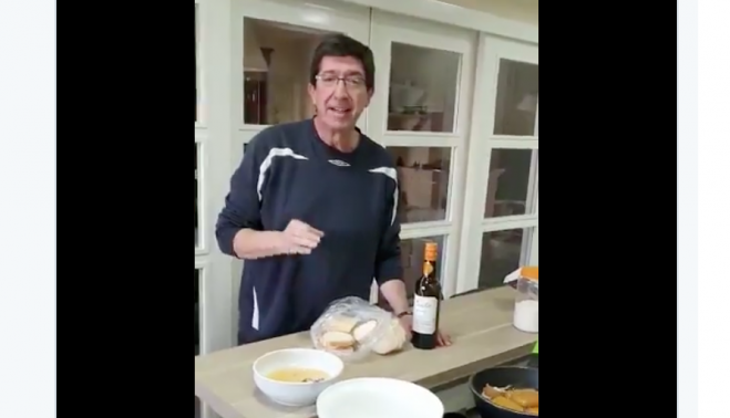 El vicepresidente de la Junta de Andalucía, Juan Marín, ha recibido numerosas críticas tras subir un vídeo a sus redes sociales con una receta sobre torrijas en plena cuarentena por el coronavirus. "En estos días de confinamiento, que tenemos que estar en casa, vamos a explicaros cómo hacemos en Sanlúcar las torrijas", expresa en Marín al inicio de un vídeo que dura poco más de cuatro minutos.