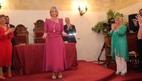 Eran las once y cuarto de la mañana cuando María José García-Pelayo ha sido proclamada nueva alcaldesa de Jerez. Ocho años después, Pelayo ha tomado de nuevo el bastón de mando del Ayuntamiento de Jerez de manos de Carmen Collado, presidenta de la mesa de edad, y ha saludado a los miembros de la nueva Corporación salida de las urnas el pasado 28M, y a las autoridades y público en general que atestaba el Cabildo viejo.