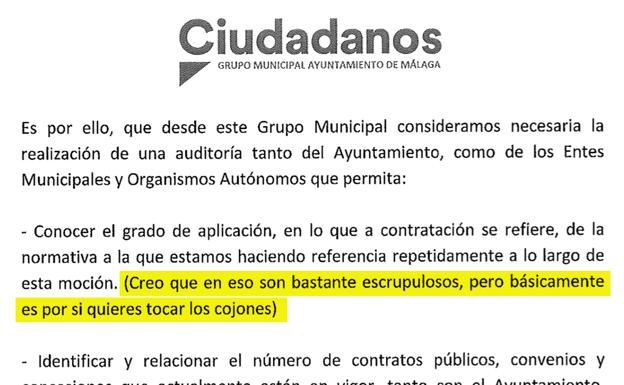 El grupo municipal de Ciudadanos en el Ayuntamiento de Málaga ha presentado una iniciativa a la comisión de Economía para conocer el grado de aplicación en los asuntos de contratación del Consistorio. No obstante, en este apartado, entre paréntesis, explican que lo hacen porque "creo que en eso son bastante escrupulosos, pero básicamente es por si quieres tocar los cojones". Así lo ha informado Diario Sur.