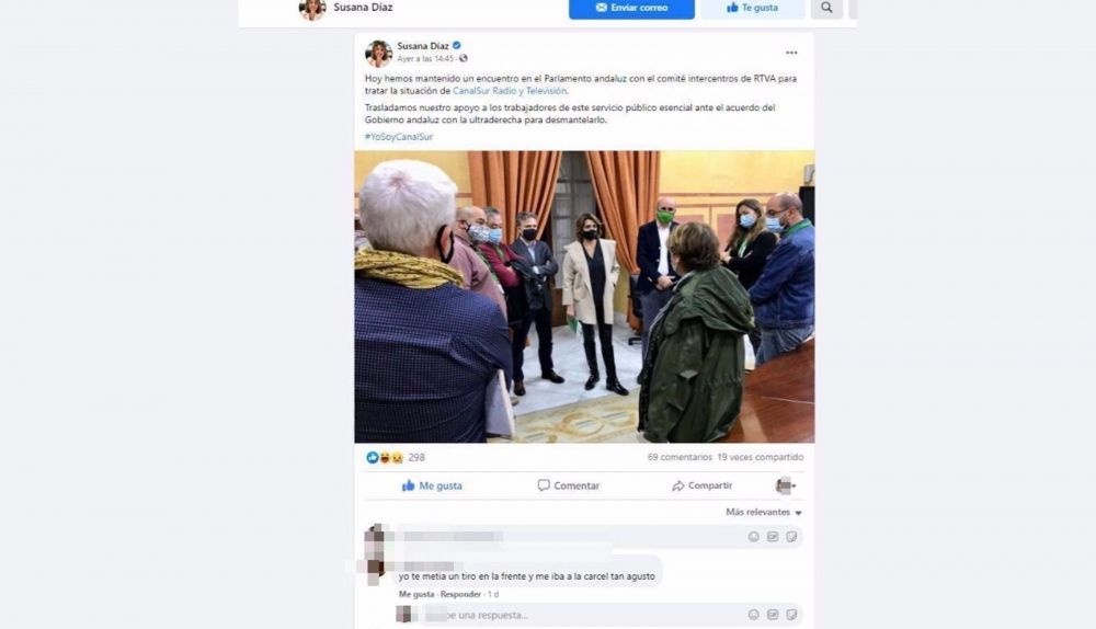El PSOE-A ha presentado una denuncia ante Policía Nacional por la "amenaza de muerte" que ha sufrido su secretaria general, Susana Díaz, a través de una red social. La denuncia se interpuso la pasada semana después de que un hombre amenazara a Susana Díaz con pegarle un "tiro en la frente", a través de un mensaje en Facebook, en respuesta a un post que puso la dirigente socialista sobre su reunión el pasado miércoles con el comité intercentros de la RTVA.
