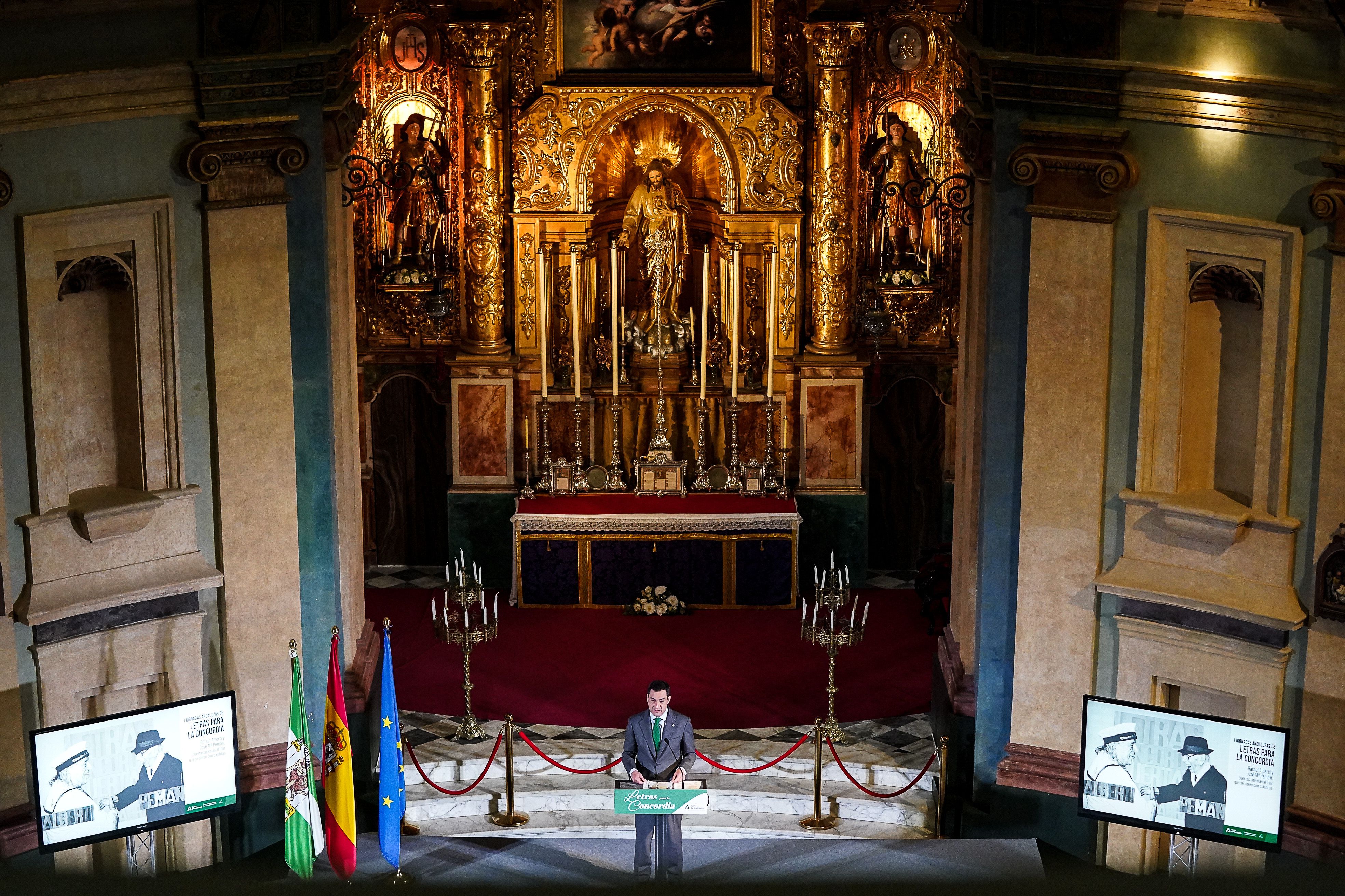 Sin embargo, muy a gusto con los postulados de la ultraderecha, el presidente de la Junta ha vuelto a blanquear al autor de El ángel y la bestia en el transcurso de su intervención durante el acto inaugural de las jornadas Letras para la Concordia, celebrado en el Oratorio de San Felipe Neri de la capital gaditana, y que ha pretendido elogiar las figuras de Pemán y Alberti. Un evento que surge como acto de desagravio organizado por el ala PP de la Junta a raíz de que el año pasado el Ayuntamiento de Cádiz ordenara retirar la placa que le homenajea en su casa natal y le retirara, junto a otros reconocidos franquistas, el título de Hijo Predilecto, en cumplimiento de la Ley de Memoria.