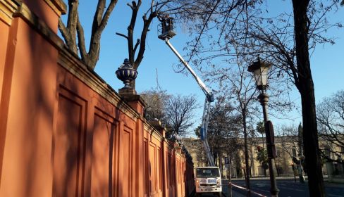 La Consejería de Presidencia de la Junta de Andalucía ha adjudicado a finales de julio un contrato para la restauración de los remates cerámicos de diez jarrones que se encontraban en mal estado en el muro perimetral que delimita los Jardines del Palacio de San Telmo, ubicado en el Paseo de las Delicias, junto a las calles Rábida y Palos de la Frontera.