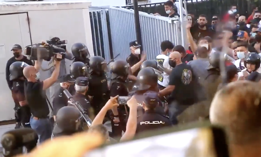 Una multitud ha rodeado el Parador desde las 19.00 horas después de que Vox cambiase por una rueda de prensa al aire libre en otra ubicación el mitin que originalmente iba a celebrar ante la Delegación del Gobierno, prohibido por el riesgo de que se produjesen "daños personales o en los bienes" ante su posible confluencia con movilizaciones no comunicadas oficialmente a través de las redes sociales "contra tanto facha".