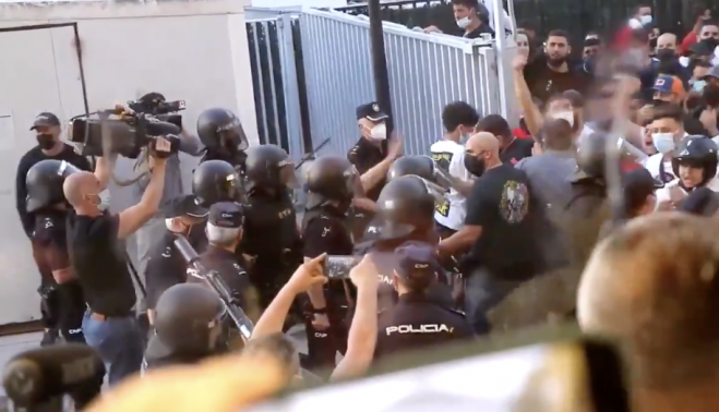La Policía Nacional ha desplegado un gran operativo policial para evitar altercados entre la muchedumbre concitada para increpar a Abascal entre gritos de "racista" e "hijo de puta" y los afines a Vox, unos cuarenta líderes locales y nacionales del partido mezclados con un grupo de jóvenes simpatizantes.