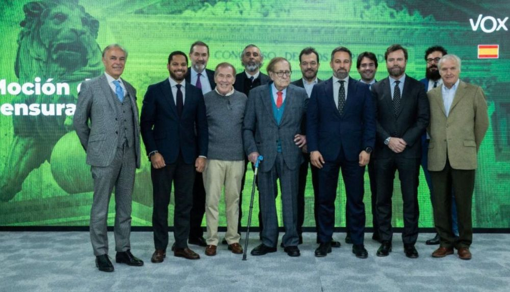 Pero no ha sido la confirmación de Tamames como el elegido de Vox para la moción lo más llamativo y comentado en las redes. La foto del anuncio de la presentación es la que ha causado un gran revuelo.