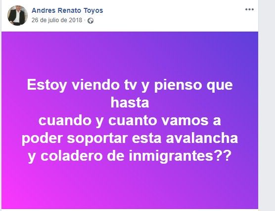 A través de Facebook, este miembro de la lista de los populares, que aparece como independiente, difunde contenidos de carácter racista y xenófobo, como un inmigrante tirando piedras en el que se dice "momento histórico en el que se puede observar a un inmigrante trabajando para pagar la pensión de nuestros mayores. Compártelo, no te lo quedes". De la misma forma, Renato Toyos hace lo propio compartiendo fake news como la de la falsa alerta sanitaria, en la que una plataforma digital decía que inmigrantes con sarna, tuberculosis y VIH habían contagiado a la Policía Nacional.