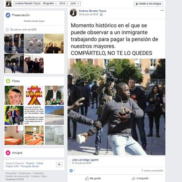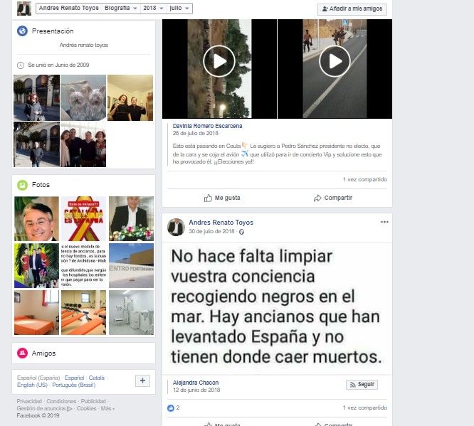 "No hace falta limpiar vuestra conciencia recogiendo negros en el mar. Hay ancianos que han levantado España y no tienen donde caer muertos". Es una de las publicaciones en redes sociales Andrés Renato Toyos, número 23 en la candidatura del Partido Popular a la Alcaldía de Jerez el próximo 26 de mayo.