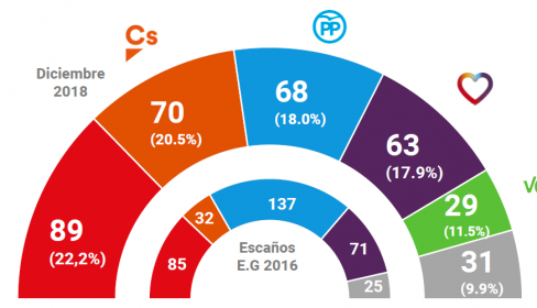 El sondeo de Metroscopia, que se realizo una semana después de las elecciones andaluzas, entre el 10 y el 12 de diciembre, indica que estamos ante ese escenario. Las derechas, que entre PP, Ciudadanos y Vox sumán más de la mitad del electorado, tendrían 167 escaños frente a los 152 que sumarían PSOE y Unidos Podemos. Pese a esos hipotéticos resultados, que hablarían de un triunfo de las derechas, el empate técnico es evidente. PP, Ciudadanos y Vox difícilmente podrían gobernar España, teniendo en cuenta que el resto de los grupos parlamentarios no les apoyarían. La única susceptible de dar un apoyo a la derecha, el Partido Nacionalista Vasco, no lo haría dada la concepción centralista de Ciudadanos y Vox.