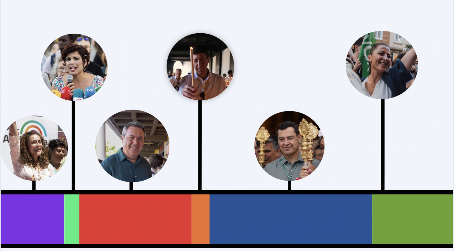 Según el sondeo, elaborado por la empresa easiest, el candidato a la reelección, Juan Manuel Moreno, obtendría 44 escaños (1.282.756 votos, 32,6%) el próximo 19 de junio, frente a los 35 del PSOE de Espadas —que mejoraría en dos los resultados obtenidos por Susana Díaz en 2018 con 1.074.210 papeletas, el 27,3% de los votos—.