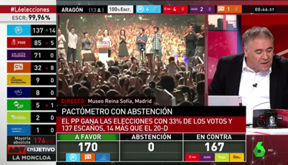 Todo eso se fue al traste este 19j. Ferreras no pudo ni mencionar su 'maquinita' porque el escrutinio fue claro desde el primer momento. El PP comenzó a subir. Y subió. Y siguió subiendo. Hasta que sobrepasó la mayoría asboluta. Eso imposibilitó que el pactómetro pudiera disfrutar de una noche más de gloria porque los pactos no hacían falta. La estabilidad es el mayor enemigo del pactómetro.