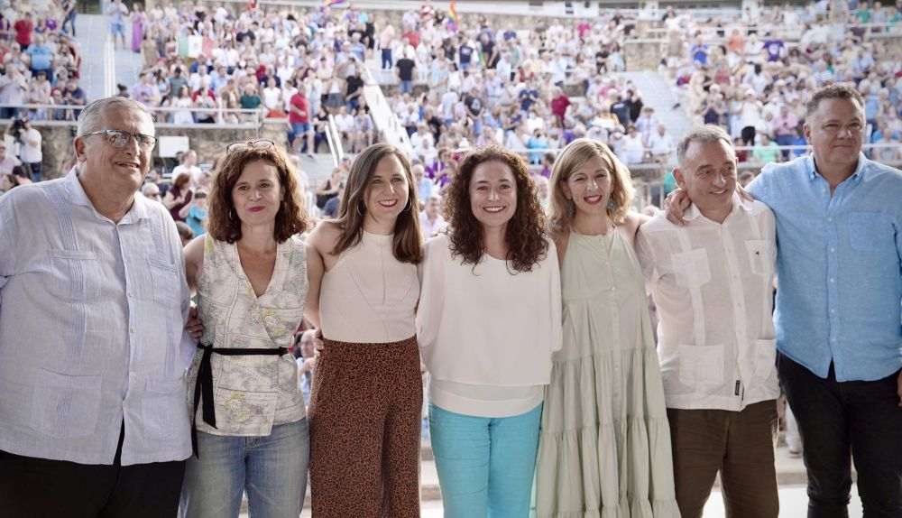 El Teatro de la Axerquía de Córdoba, donde se han dado cita unos 2.500 asistentes, según la organización, se ha convertido en el escenario del mitin más multitudinario de la confluencia desde que comenzó la campaña. Con casi 35 grados en el recinto, según relata Europa Press, se asistió con botellas de agua a los oradores, y se ondeó alguna bandera LGTBI, alguna del PCE y también de Andalucía.