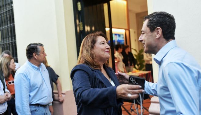 Juanma Moreno, líder del PP-A, saluda a Carmen Crespo, andaluza y número 2 en la lista de los populares al Parlamento Europeo este 9J. MAURI BUHIGAS