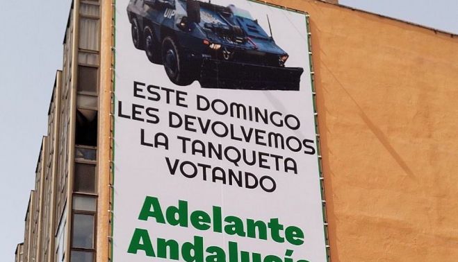 "Este domingo les devolvemos la tanqueta votando Adelante Andalucía", se puede leer en una lona colgada este martes en una calle del centro de Madrid.