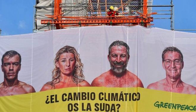 "¿El cambio climático os la suda?", es la pregunta que hace Greenpeace a los principales candidatos a la Presidencia del Gobierno, en una lona gigante desplegada en la Puerta de Alcalá de Madrid, con retratos de Pedro Sánchez, Alberto Núñez Feijóo, Yolanda Díaz y Santiago Abascal.