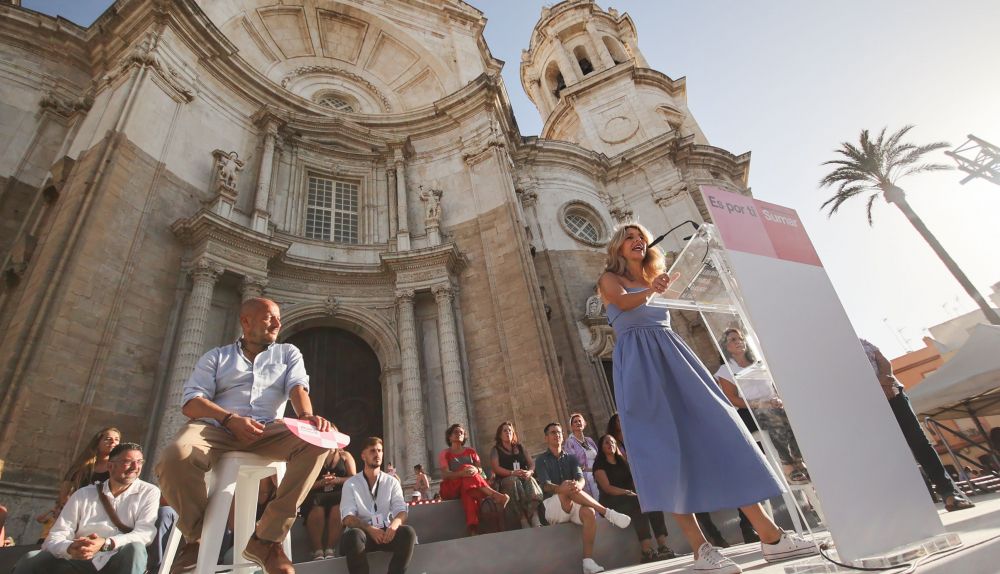 "Algunos han dicho que la política industrial es aquella que no existe, pero no es verdad. Cádiz va a tener futuro, un futuro industrial y laboral", afirma Yolanda Díaz. Presume de una reforma laboral que ha dado estupendos números y asegura que va a "seguir subiendo el Salario Mínimo Interprofesional (SMI) y el resto de salarios", además de "reducir la jornada" para compatibilizar la vida laboral con la otra, la real.
