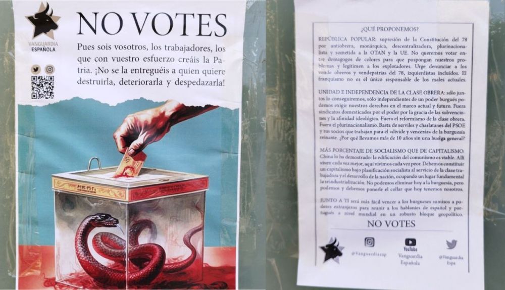 Vanguardia Española, que se presenta en su página web como una asociación con clara vocación de servicio a la sociedad, ha colocado carteles por el centro de Jerez pidiendo que no se vote porque “sois vosotros, los trabajadores, los que con vuestro esfuerzo creáis la patria. ¡No se la entreguéis a quien quiere destruirla, deteriorarla y despedazarla”.