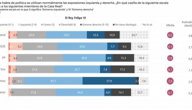 En una escala de 0 a 10, en la que 0 es extrema izquierda y 10 extrema derecha, los españoles ubican al monarca actual en el 6,5, claramente escorado a la derecha y coincidiendo en espacio ideológico con los votantes del PP, que se auto ubican en el 6,6. Los votantes de los cinco partidos mayoritarios de ámbito estatal (PSOE, PP, Vox, Unidas Podemos y Ciudadanos) coinciden en posicionar a Felipe VI en la derecha ideológica, en una horquilla que va del 5,9 (centro-derecha) donde lo sitúan los votantes del PP, al 7,9 (posiciones cercanas a la extrema derecha) donde lo sitúan los votantes de Unidas Podemos. Esta percepción de Felipe VI como un monarca con clara ideología de derechas contrasta con un dato recogido en la encuesta: la población española le da una importancia de 8 sobre 10 al hecho de que un monarca sea políticamente neutral.