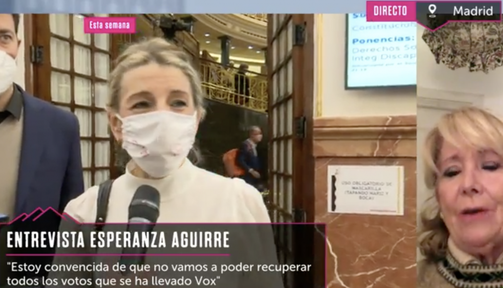 Esperanza Aguirre, expresidenta de la Comunidad de Madrid, ha sido entrevistada este domingo en el programa La Roca de LaSexta, presentado por Nuria Roca, quien le ha preguntado por la actualidad política del país. Además de por el PP y la guerra interna, Aguirre se ha pronunciado por otro nombre propio: Yolanda Díaz.
