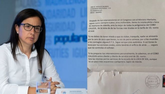 Una carta, sin nombre en el remite, en el que el autor amenaza e insultada de forma grave a Vázquez. “Después de tus intervenciones en el Congreso con el ministro Marlaska, sigues como siempre o peor. Eres inalterable, tienes la misma pinta y boca de mamona de mierda. Eres la mejor de todas las poligoneras del Cobo Calleja, de la zona de las furcias más tiradas en la tarifa de 10 euros el oral”, empieza diciendo la misiva.