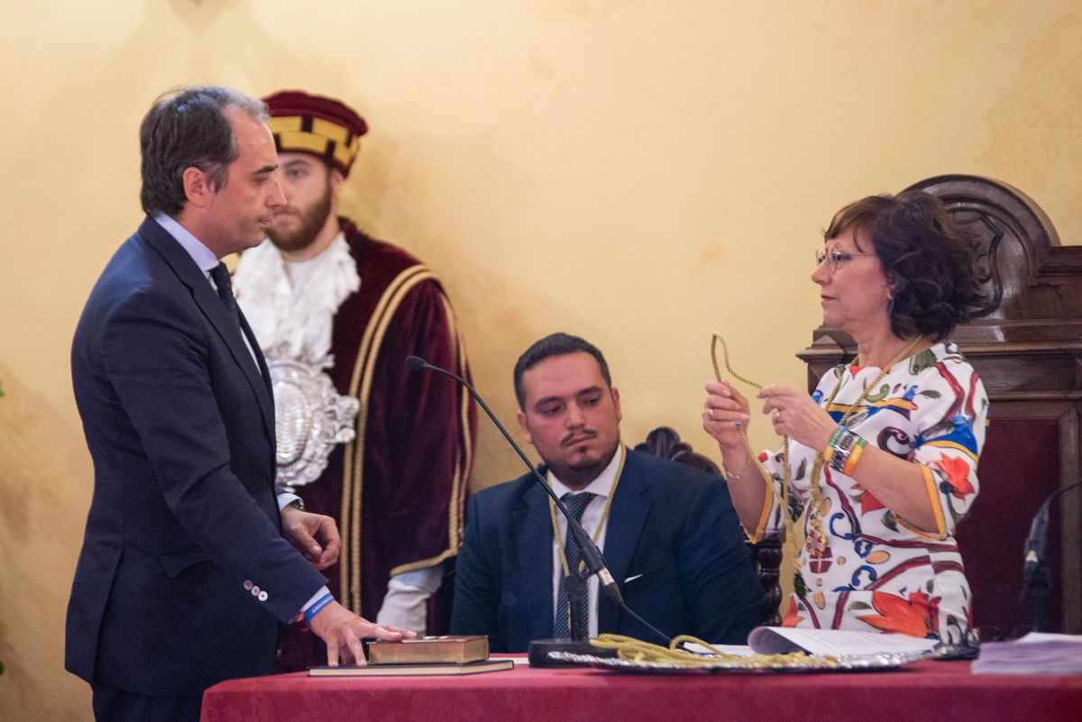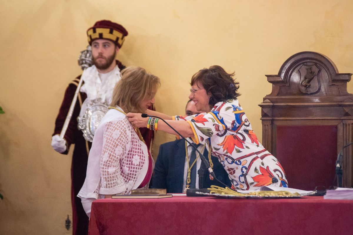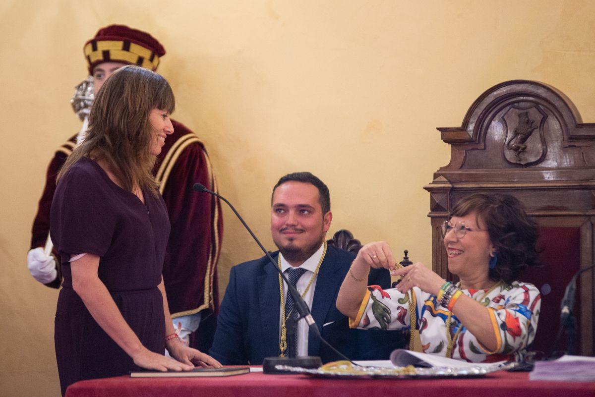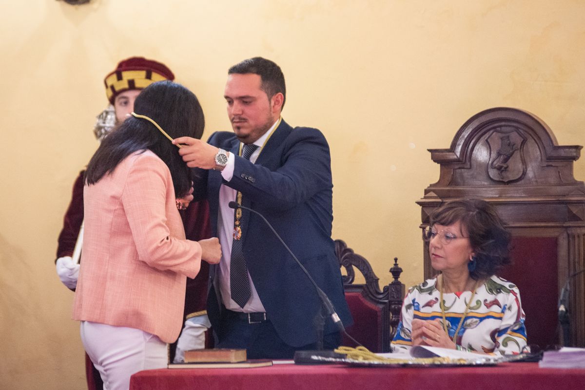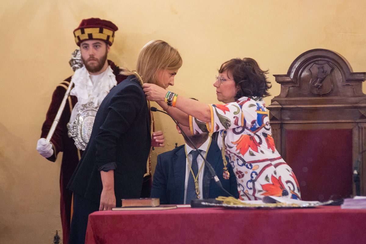 Mamen Sánchez recibe su medalla como concejal de manos de Carmen Collado, la primera en recibirla de manos del secretario municipal por ser la miembro de la Corporación de mayor edad. FOTO: MANU GARCÍA
