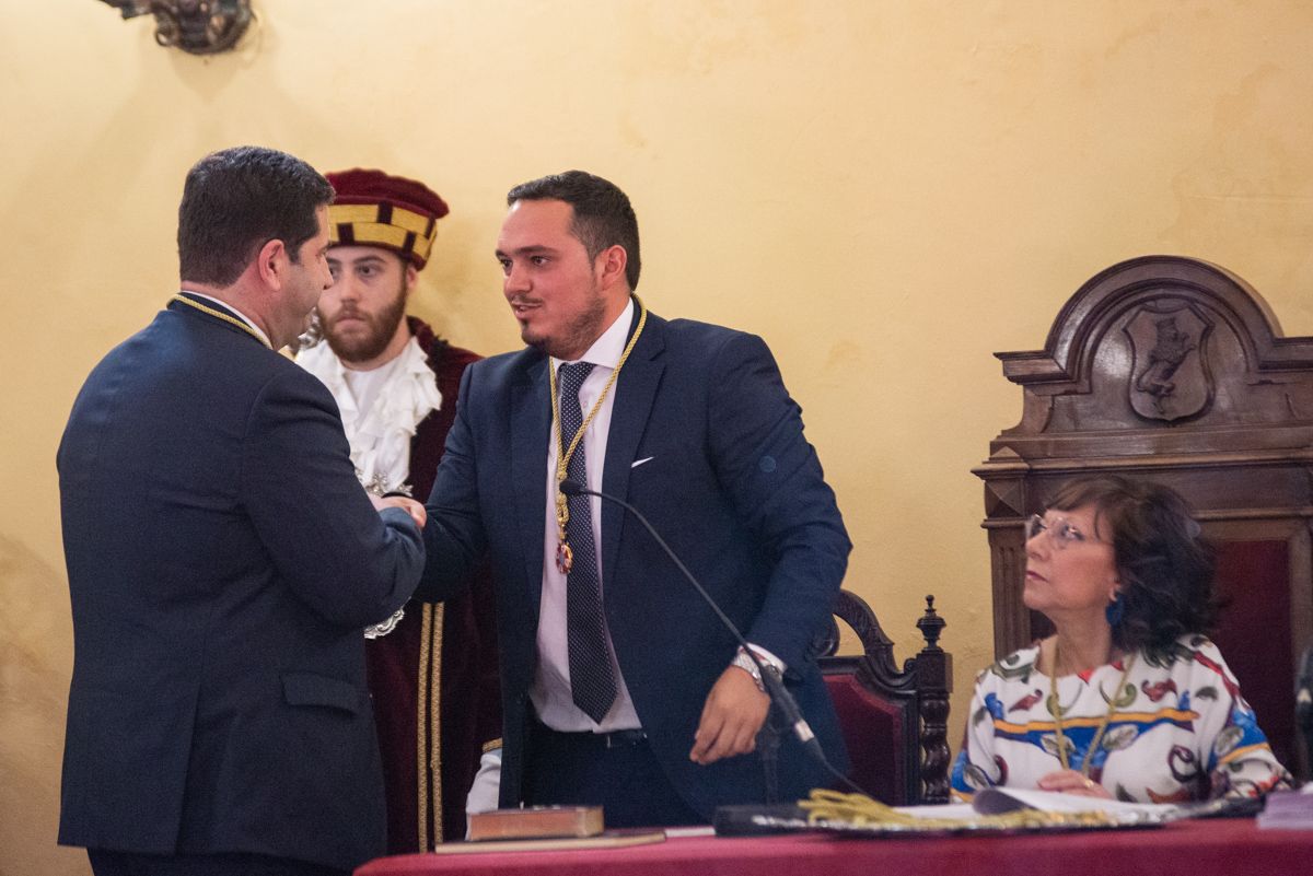 José Antonio Díaz, número 2 del PSOE, recibe su medalla de manos de Jesús Alba, que la recibió en segundo lugar por ser el concejal más joven del Ayuntamiento.