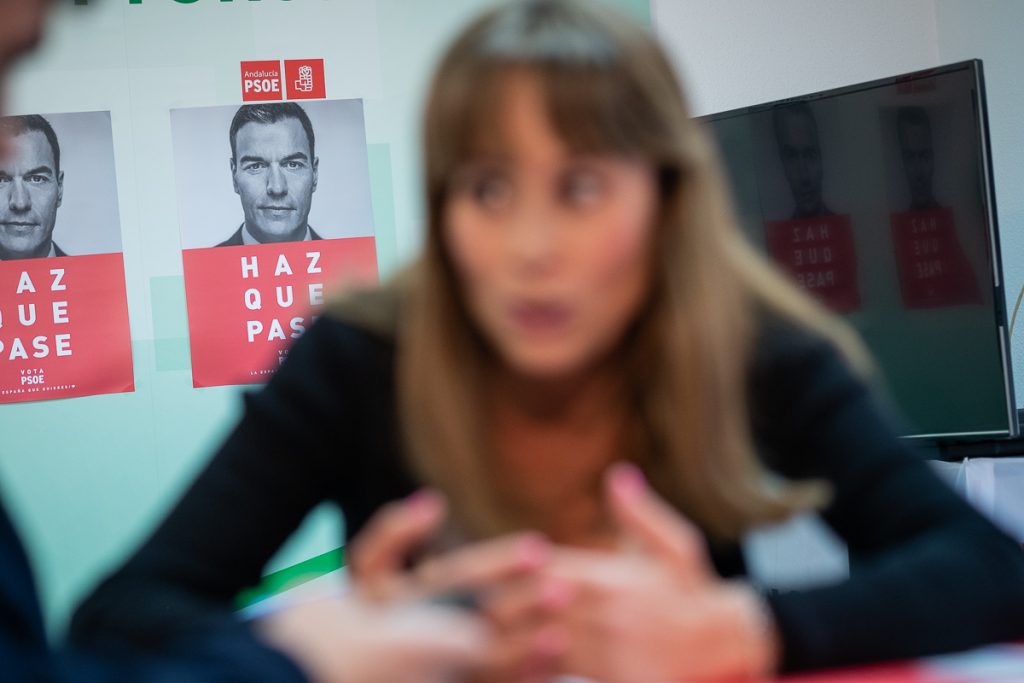 Eva Bravo en el encuentro con lavozdelsur.es con los carteles de la campaña del 28A detrás. FOTO: MANU GARCÍA.