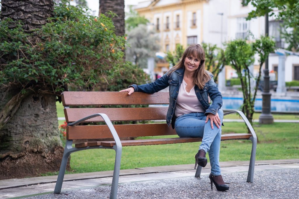 La socialista Eva Bravo, en un banco de la plaza del Mamelón, frente a la sede de la agrupación del PSOE de Jerez. FOTO: MANU GARCÍA.