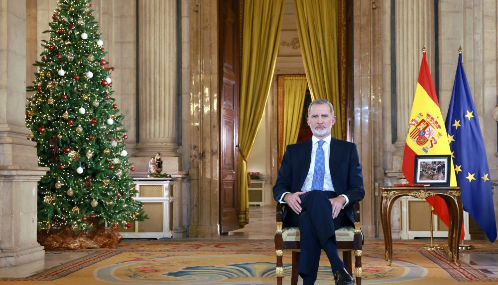 El rey de España, Felipe VI, ha ofrecido este 24 de diciembre su décimo discurso de Nochebuena. Lo ha hecho con una imagen detrás de él de las riadas por la DANA de Valencia.