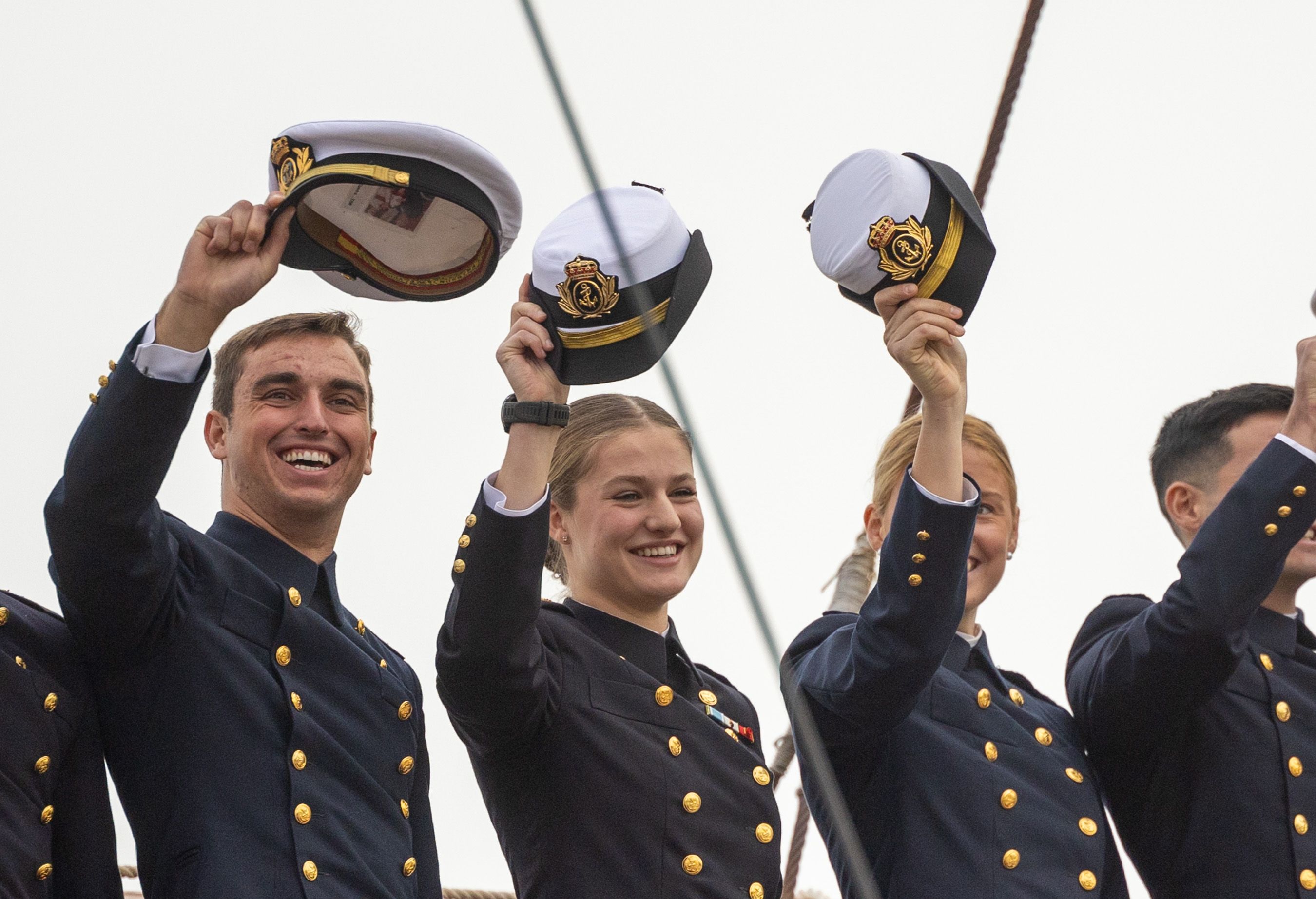 Los Reyes de España, Felipe VI y Letizia, han despedido a su hija mayor acompañados también por el delegado del Gobierno en Andalucía, Pedro Fernández; el presidente de la Junta, Juanma Moreno, y el alcalde de Cádiz, Bruno García, además de otros representantes institucionales como la presidenta de la Autoridad Portuaria de la Bahía de Cádiz, Teófila Martínez, y la presidenta de la Diputación, Almudena Martínez, entre otros.