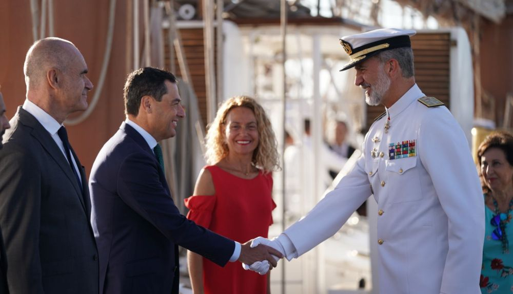El presidente de la Junta de Andalucía, Juanma Moreno, ha acompañado hoy en Sanlúcar de Barrameda al rey Felipe VI, quien ha quien ha presidido la revista naval que conmemora el V Centenario de la expedición que dio la vuelta al mundo.