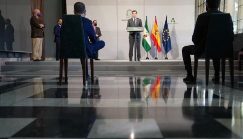 Moreno ha asumido este compromiso en una comparecencia pública desde el Palacio de San Telmo tras mantener una reunión de dos horas de duración con los presidentes de la Confederación de Empresarios de Andalucía (CEA), Javier González de Lara; de la Asociación de Trabajadores Autónomos (ATA), Lorenzo Amor, y de las Cámaras de Andalucía, Javier Sánchez Rojas, en el marco de la Alianza por Andalucía para abordar las consecuencias de las nuevas limitaciones adoptadas en Andalucía para frenar la pandemia del coronavirus Covid-19.
