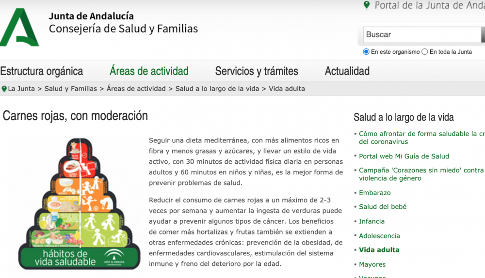 Al mismo tiempo que inicia esta cruzada, la Junta de Andalucía mantiene en su web, dentro del área de la Consejería de Salud y Familias, una información titulada Carnes rojas, con moderación, en la que, como hace el ministro Garzón, se hace eco, por ejemplo, de las recomendaciones de la Agencia Internacional para la Investigación sobre el Cáncer (IARC), organismo dependiente de la Organización Mundial de la Salud (OMS), sobre el efecto en la salud del consumo de carnes rojas y procesadas.