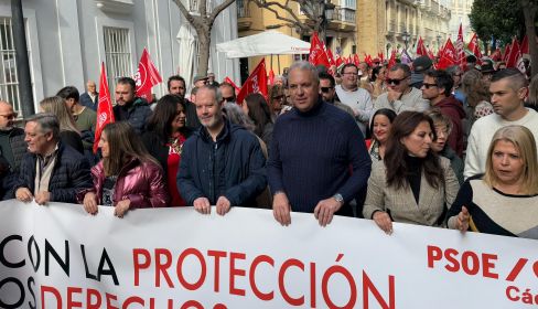 El secretario general del PSOE de Cádiz y diputado en el Congreso, Juan Carlos Ruiz Boix, junto a sus compañeras en la cámara baja, Mamen Sánchez e Isabel Moreno así como miembros de su dirección provincial y cargos orgánicos e institucionales del PSOE en la provincia, han participado este domingo en la manifestación convocada por los sindicatos UGT y CCOO en la capital en defensa del escudo social del Gobierno de España. Allí Ruiz Boix ha lamentado el tacticismo del PP que le ha llevado a jugar con los derechos de los gaditanos y gaditanas solo con el objetivo de tumbar al Ejecutivo de Pedro Sánchez.