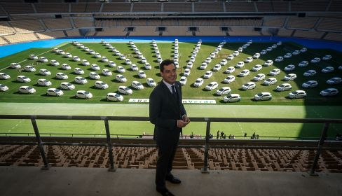 El presidente del Gobierno andaluz, Juanma Moreno, ha asistido en el Estadio de la Cartuja de Sevilla a la presentación de la nueva flota compuesta por 147 vehículos 100% eléctricos que la Junta de Andalucía ha adquirido y con los que se da un paso más en la Revolución Verde y se marca un nuevo hito en materia de sostenibilidad medioambiental y lucha contra el Cambio Climático.