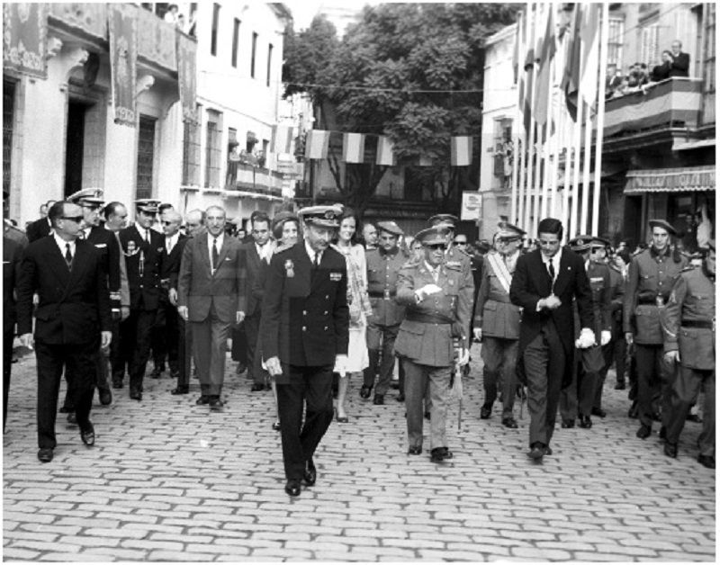 Jerez de la Frontera, 30 de octubre de 1970. El alcalde de la ciudad Miguel Primo de Rivera y Urquijo acompaña al dictador Francisco Franco. FOTO: Archivo de EFE.